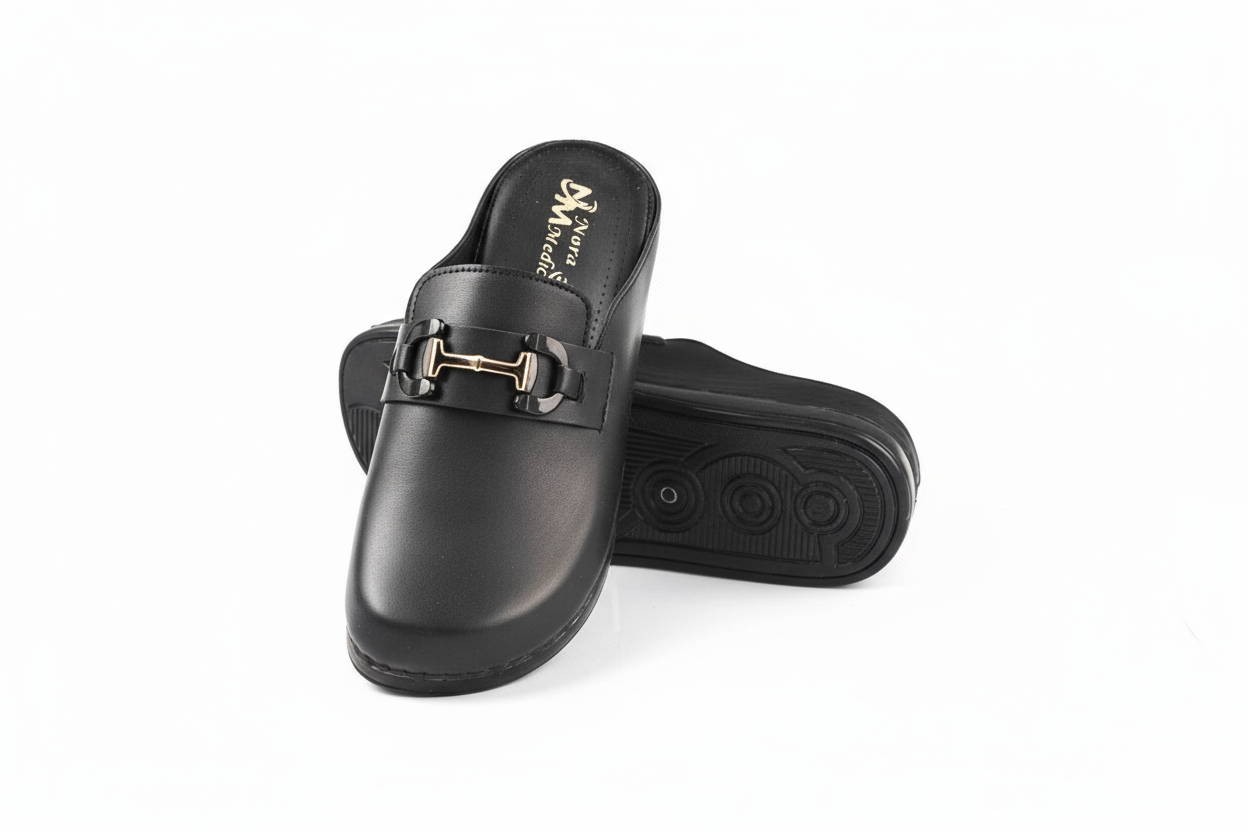 * Détail : Le dessus du pied est orné d’un mors décoratif métallique (de couleur noir chromée) qui ajoute une touche d’élégance à ce modèle fonctionnel. Le logo « Nora Médicale » est visible sur la semelle intérieure.