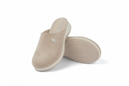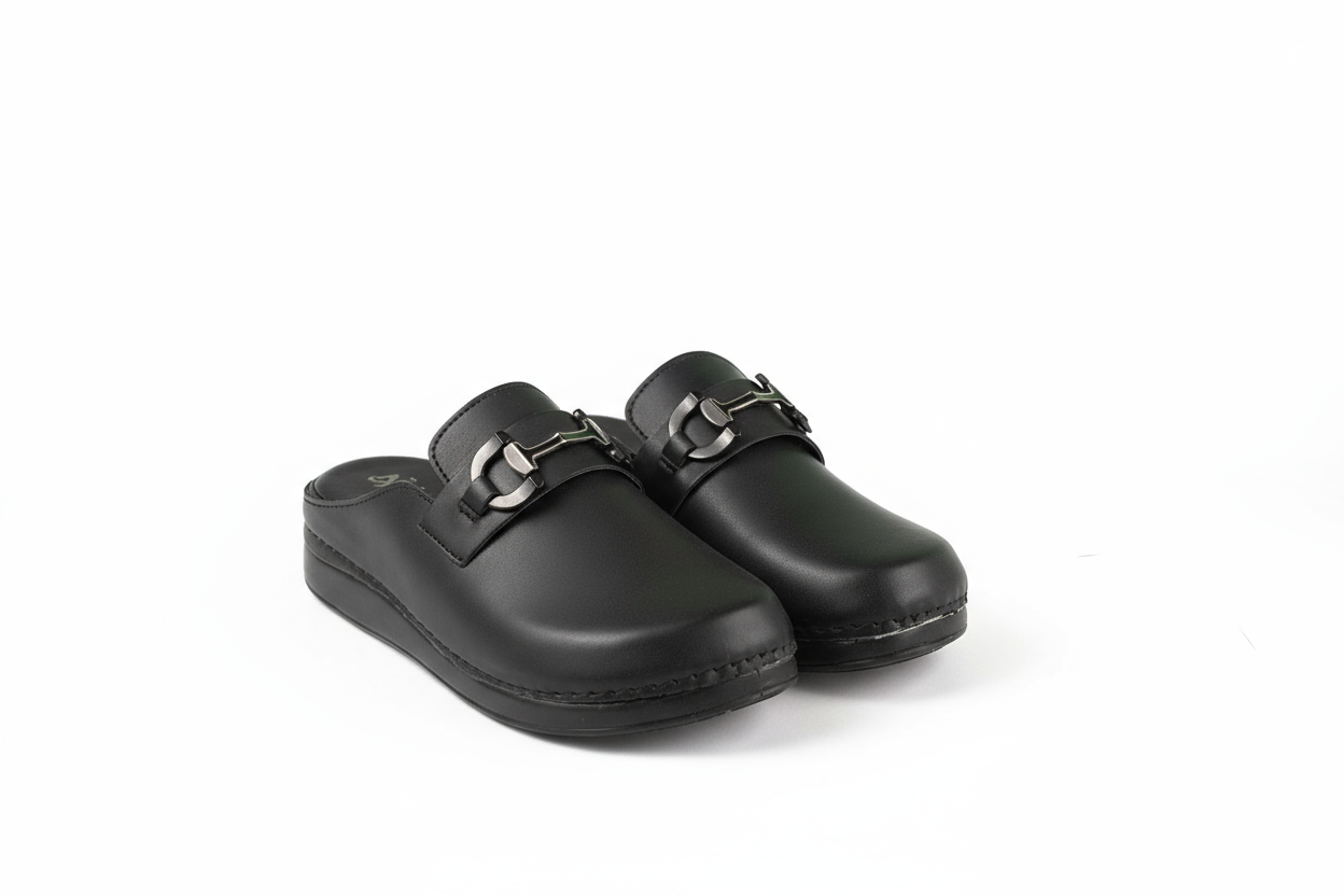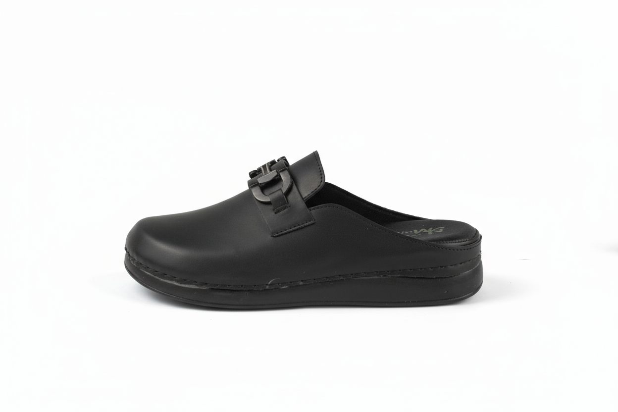 * Modèle : Mule à enfiler à bout fermé et talon ouvert, offrant praticité et rapidité d’usage.