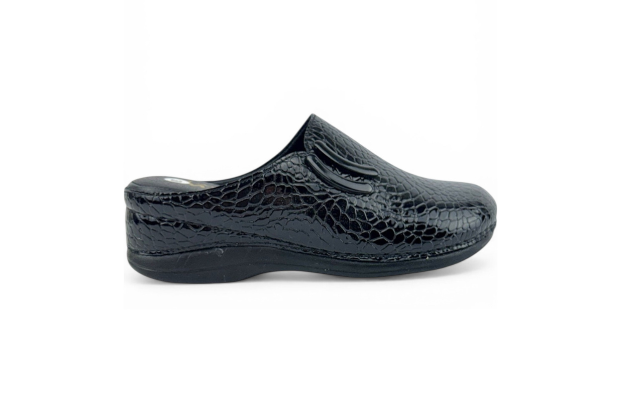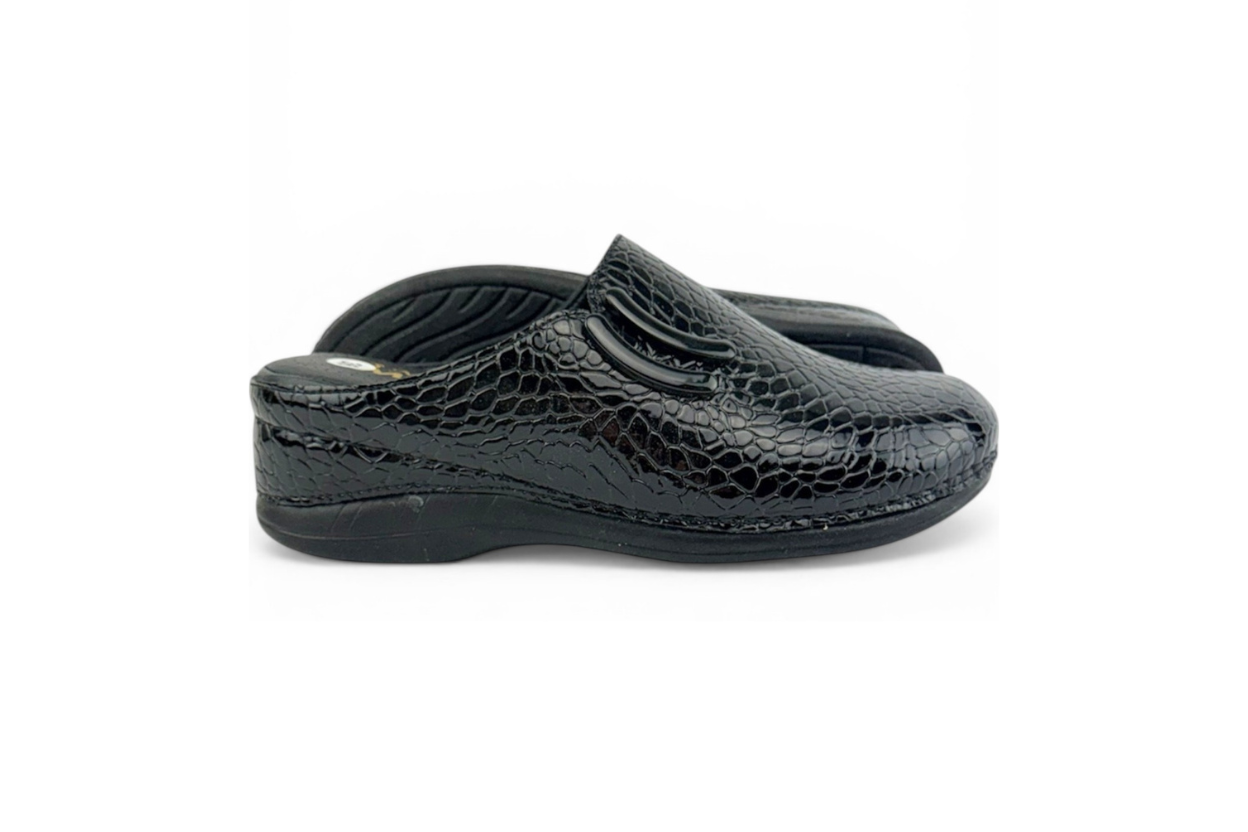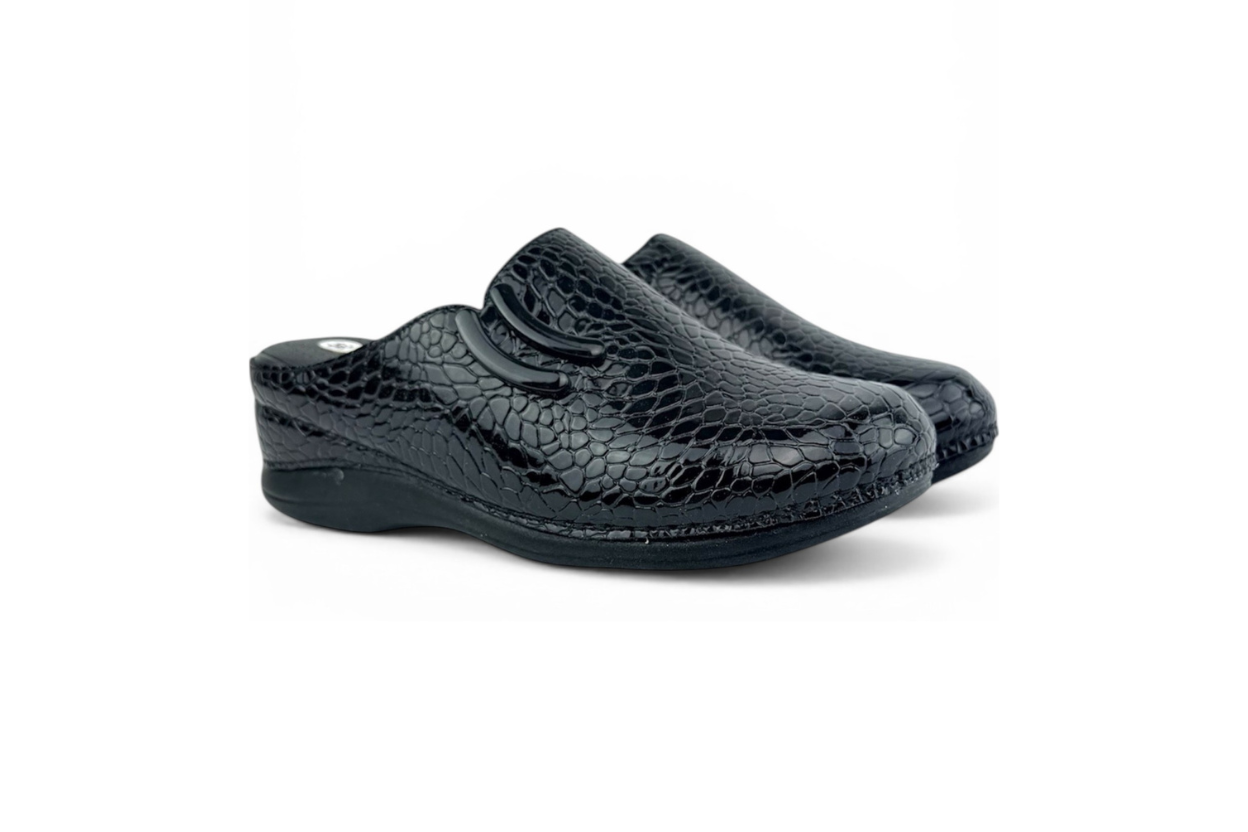 Sabot femme élégant et confortable, au design vernie intemporel avec une pièce décorative raffinée. Facile à enfiler, il offre un excellent maintien et une semelle résistante pour un confort optimal au quotidien.