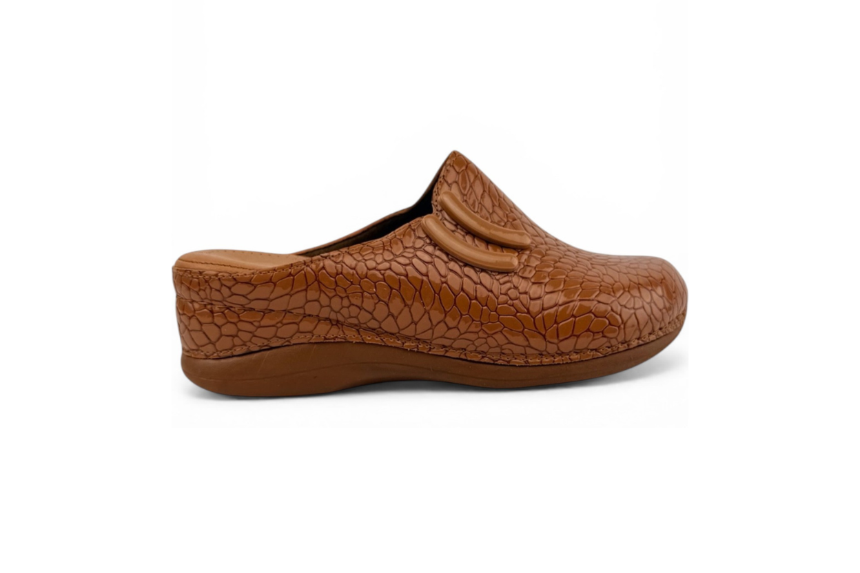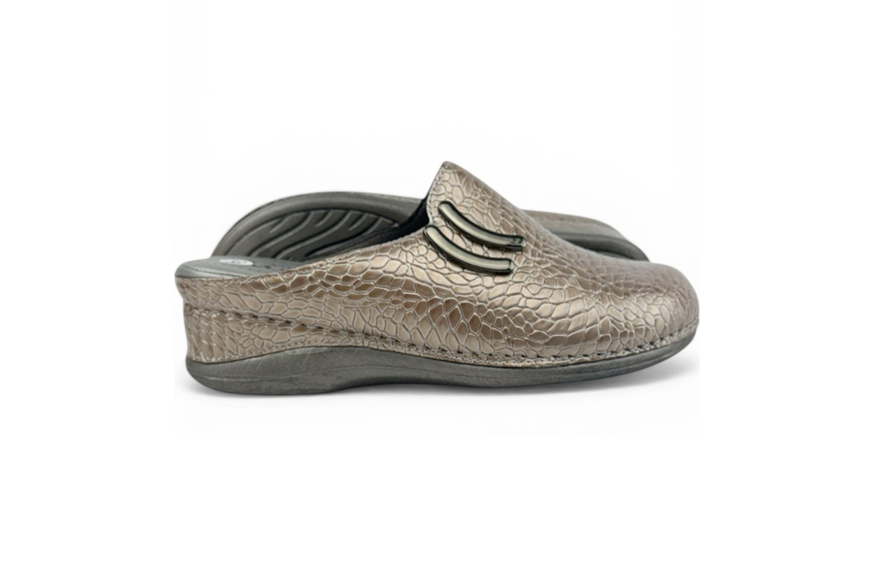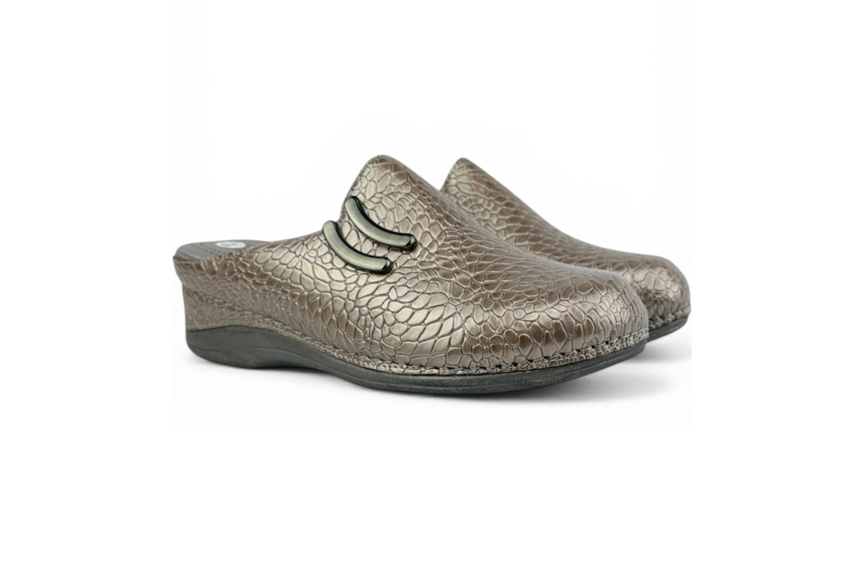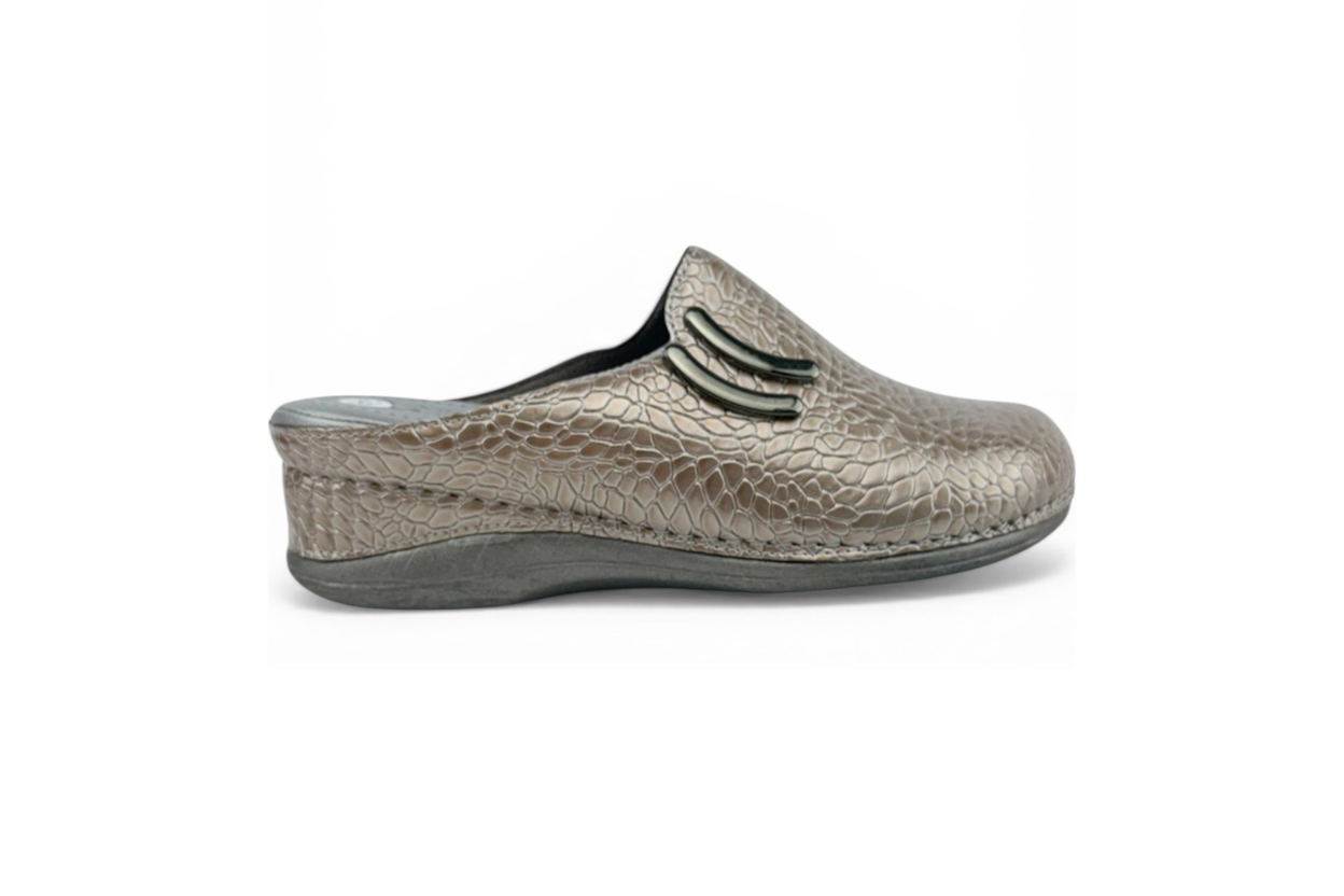 Sabot femme élégant et confortable, au design vernie intemporel avec une pièce décorative raffinée. Facile à enfiler, il offre un excellent maintien et une semelle résistante pour un confort optimal au quotidien.